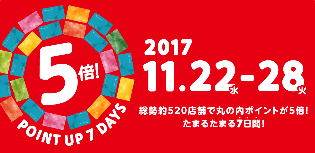 9月20日(木)~9月24日(月・祝)の5日間、三菱地所グループカード(丸の内カード一体型)のご利用で丸の内ポイントが10倍、丸の内カードのご利用で丸の内ポイントが5倍になります!9月24日(月・祝)までの入会キャンペーン等がございますので、詳しくは▶こちらをご覧ください。