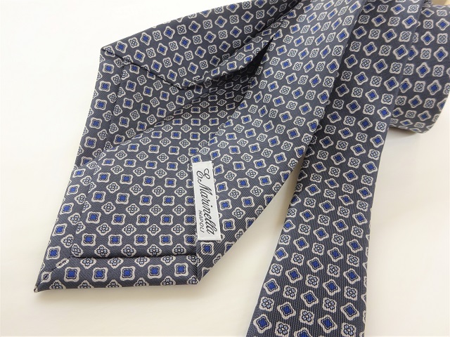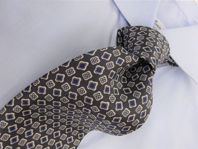 ブルーのシャツにグレーのスーツで合わせるスタイルはナポリでも定評があり、紺地のタイに次いで定番になりつつあります。