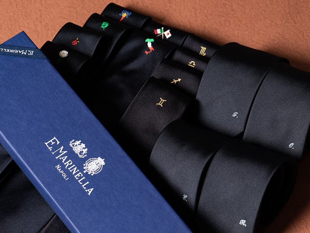 ネイビーのツイル地に刺繍が施された、マリネッラのワンポイントタイ。生地感はソリッドタイと同様にベーシックな雰囲気ですが、そこにラッキーチャームやイニシャルを取り入れることで遊び心やパーソナルなキャラクターが引き立ちます。