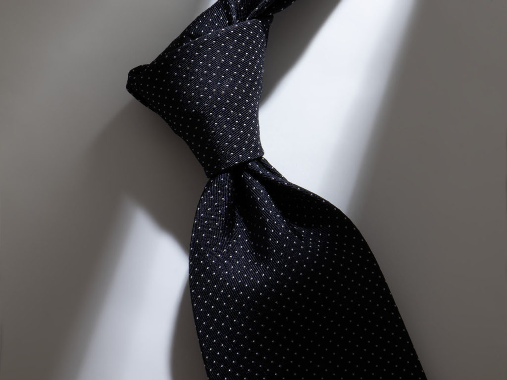 濃紺地にシルバーピンドットが映え、上品でクラシックな表情の▶❝プントスピッロ❞一見すると非常にベーシックなピンドットタイに見えますが、手に取るとジャカードの張りや光沢感、繊細な極小ピンドットが持つシックな雰囲気を感じていただけます。