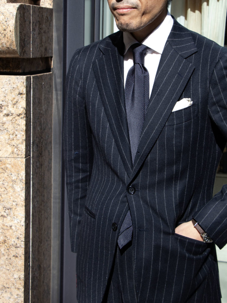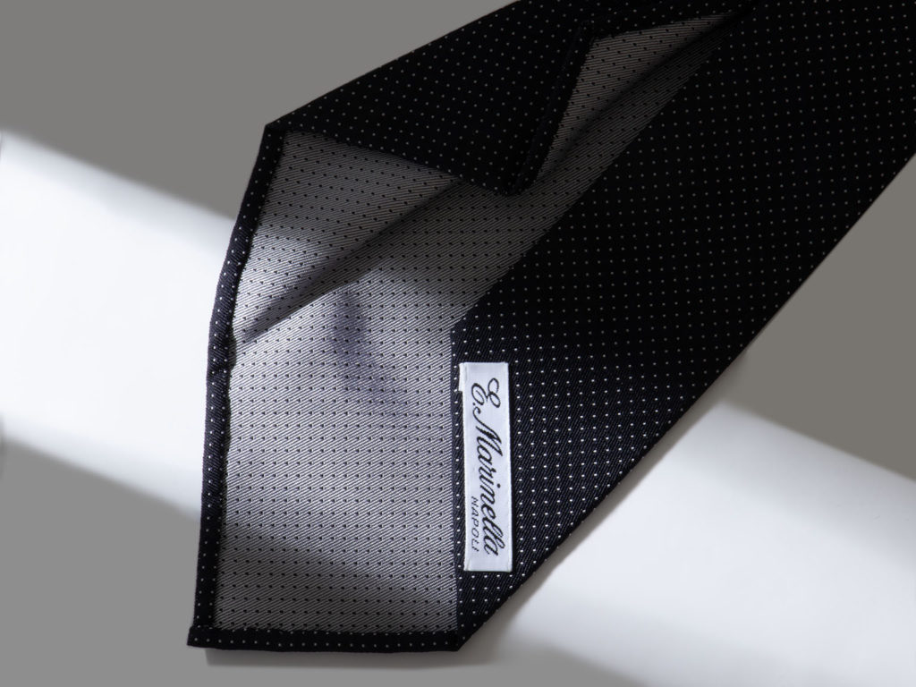 仕立ては裏地と剣先部分の芯地を省いた1枚仕立ての軽やかなセッテピエゲ スフォデラータ仕様。結び目となる位置には芯地が入っているので、ノットとディンプルもしっかり美しく決まります。