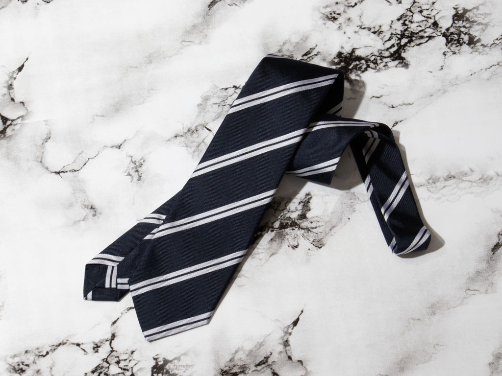 濃紺地に美しい白のダブルラインが際立ちます。このメリハリある配色は装いを引き締め、きちんとした誠実な印象を与えます。