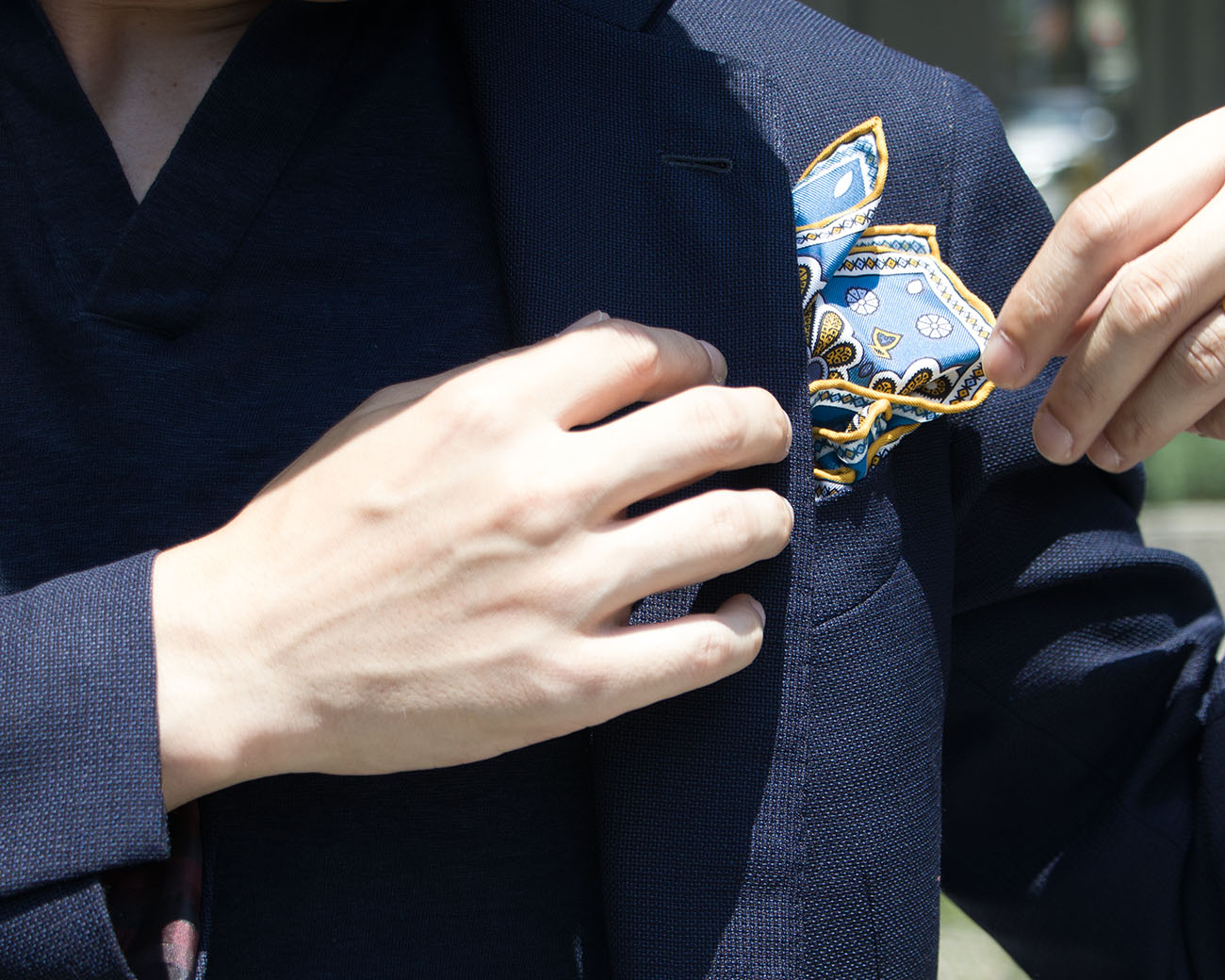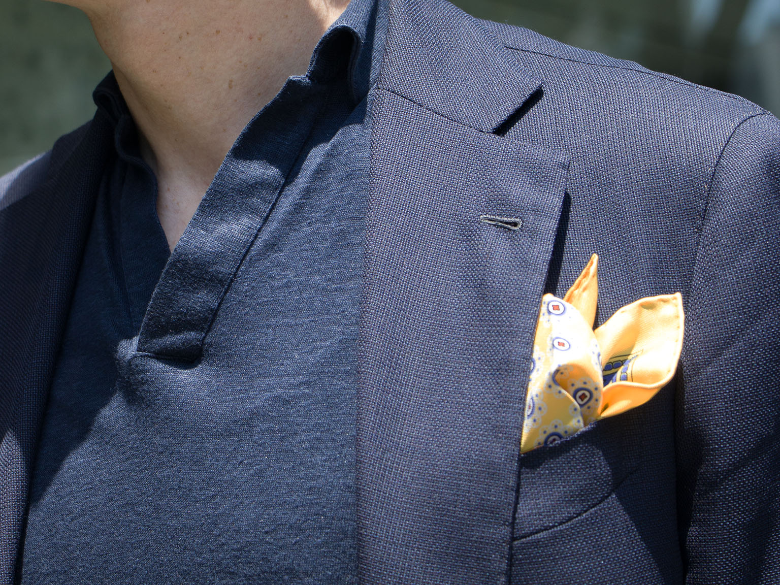 シャツ以外のインナーと合わせたノータイのジャケットスタイルにも、チーフを挿すと清潔感があり整った装いにグレードアップ。