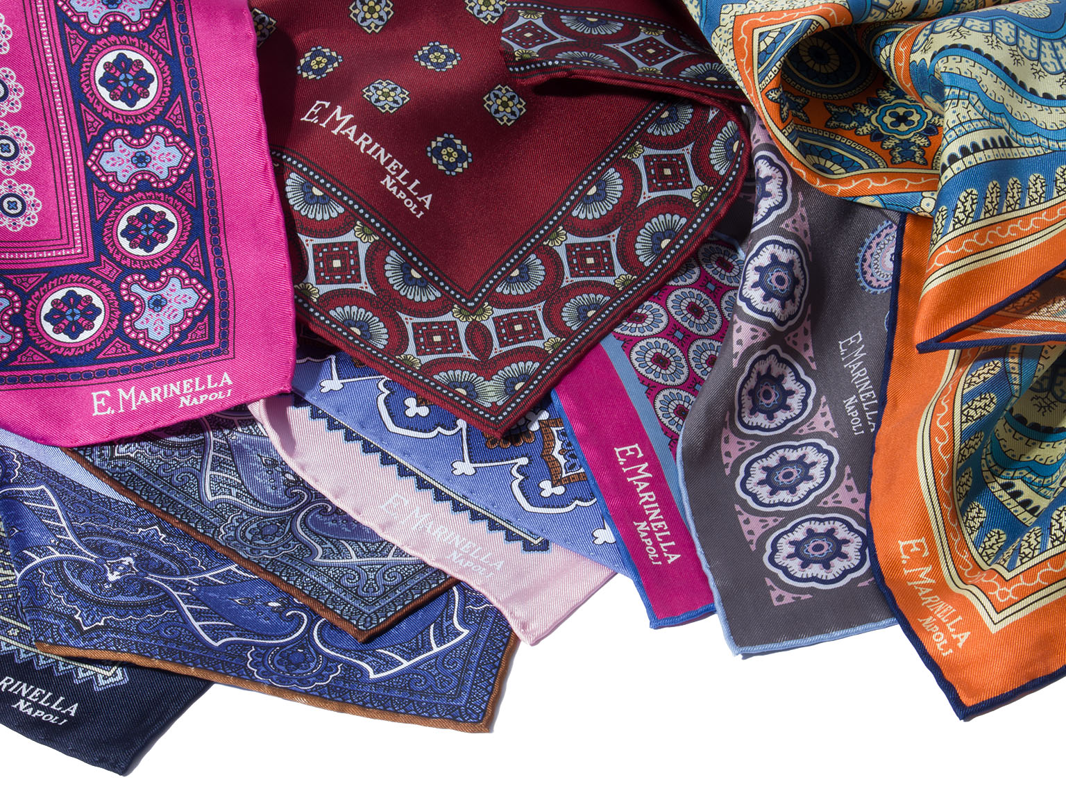 マリネッラならではの美しい発色を実現する上質なシルクに、複雑でエレガントなパターンを配しております。