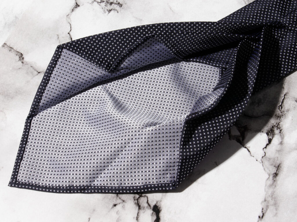 濃紺地×シルバーのクラシカルな配色と控えめな小紋が、洗練され洒落た雰囲気を醸し出す究極の一本。普段のスーツスタイルにも華と品格が漂う大人の魅力満載の『ロンドンスタイル』です。