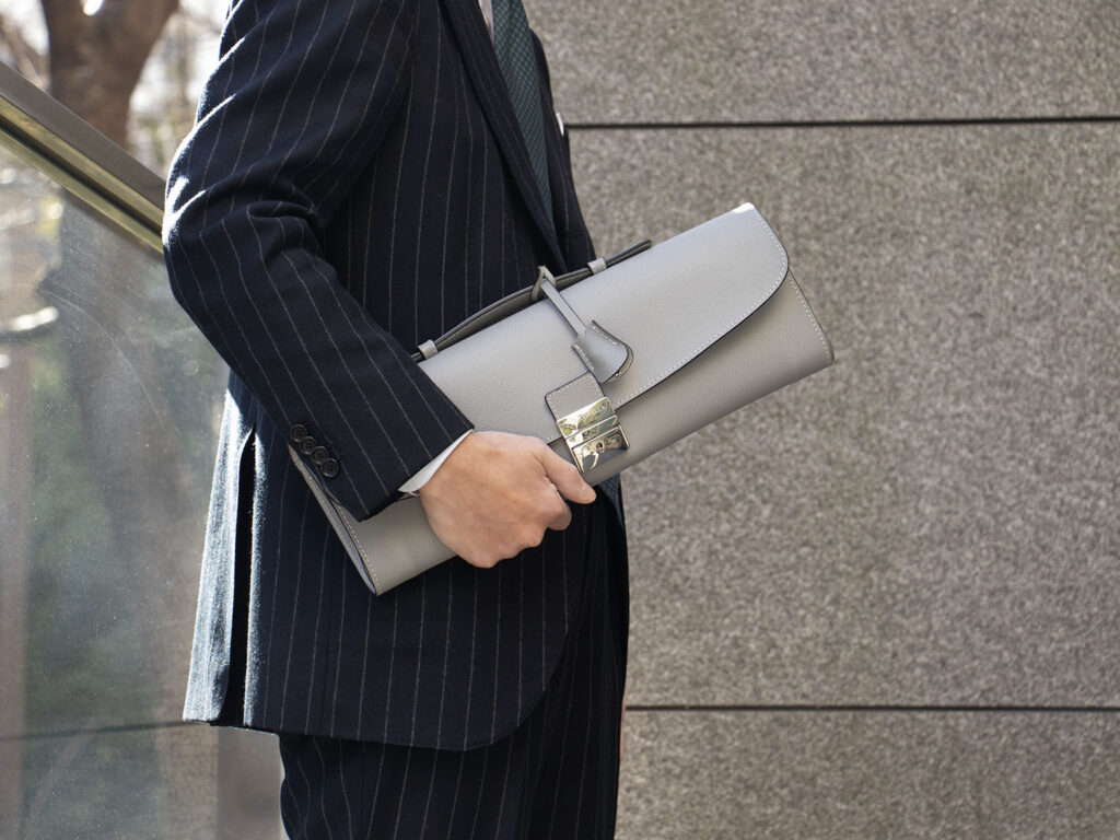折りたたんでクラッチバッグに、広げてA4サイズも楽に入るドキュメントケースとして使えて機能性抜群で、出張にもおすすめです。