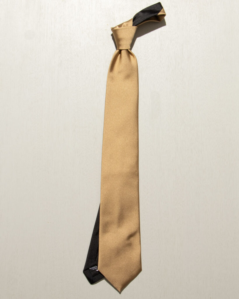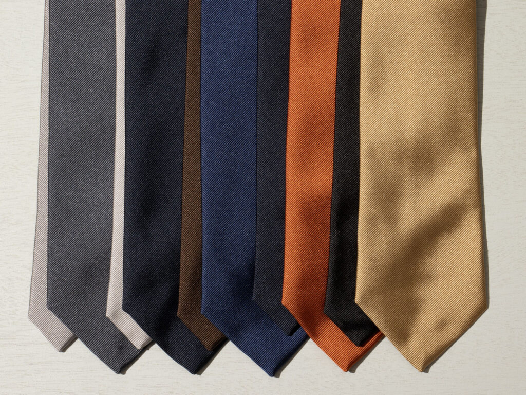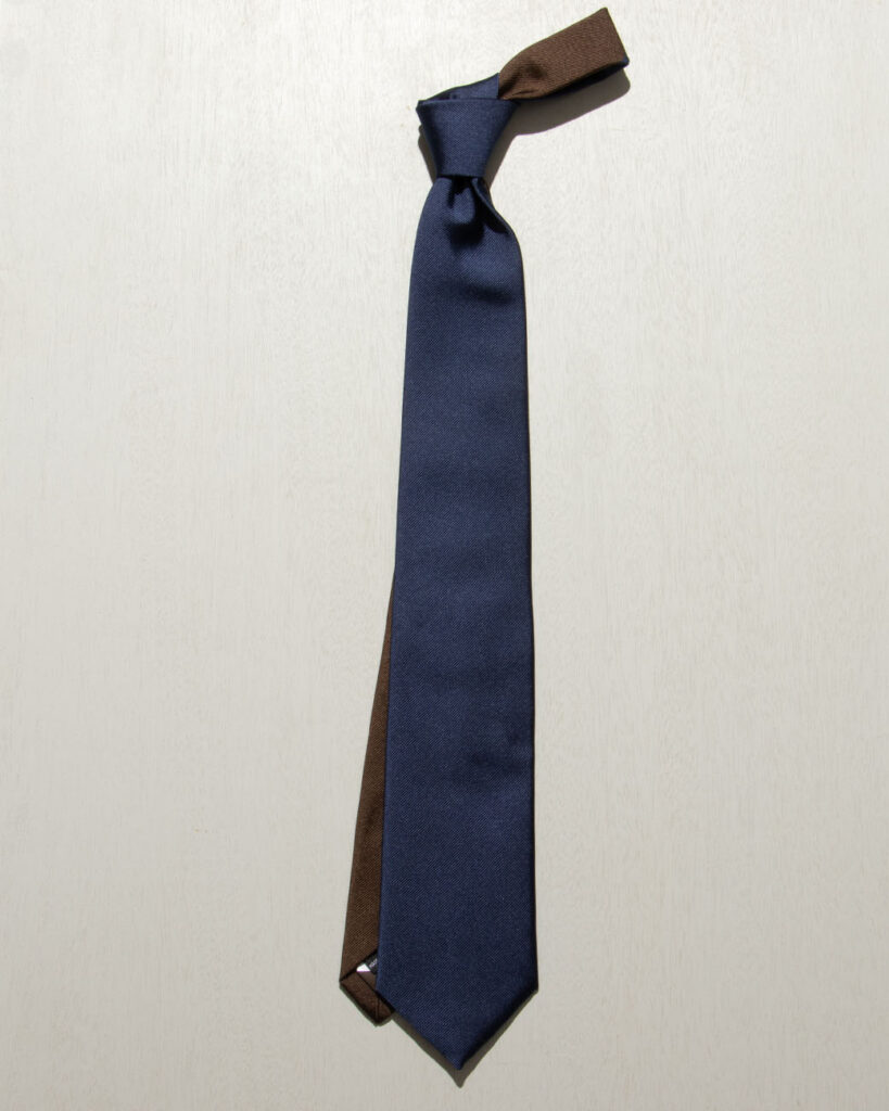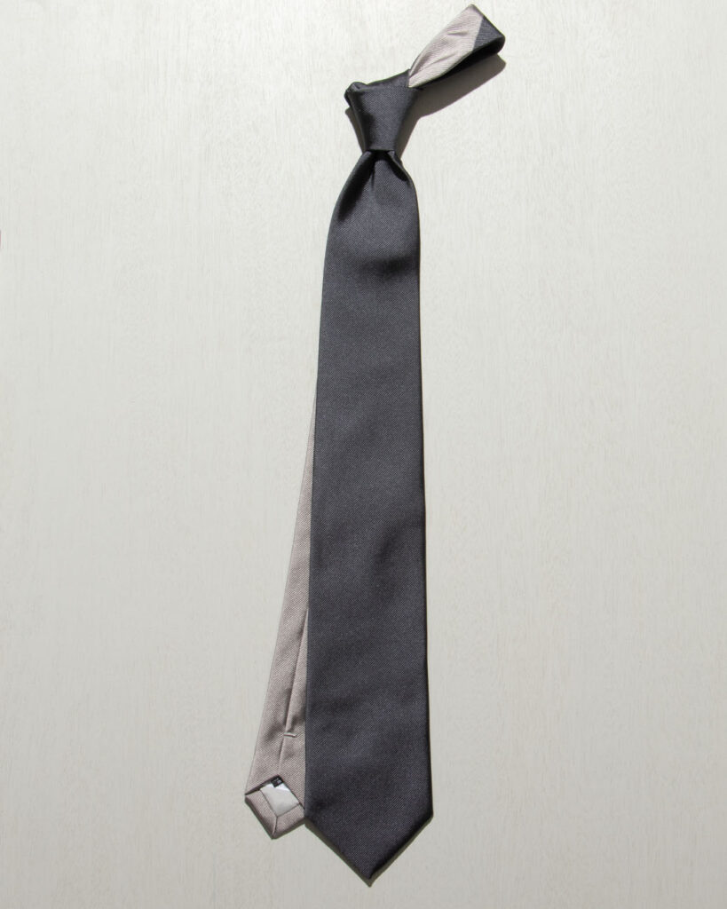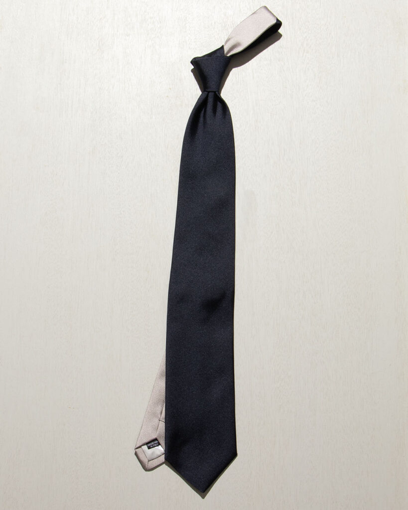一見ベーシックなソリッドでありながら、さりげなく個性を発揮するバイカラーソリッドタイ、正面からはあくまでシンプル、しかしふとした仕草やネクタイを外す瞬間に小剣のカラーがちらりと覗き、控えめな変化が装いに奥行きを与えてくれます。