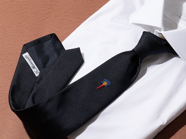 また、ネクタイを締めた際に、ちょうど、結び目の下あたりにそのワンポイントのモチーフが位置するよう仕上げられており、シャツの襟からジャケットのVゾーンにかけての最も重要なスペースに、控えめにかつ、バランス良く鎮座するその奥ゆかしさも堪らない点であります。